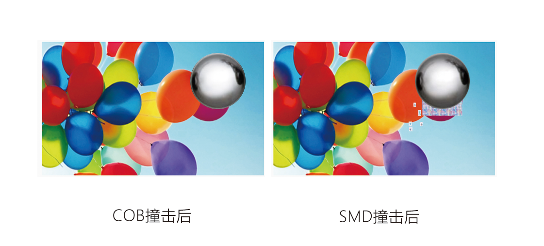 COB工藝相對(duì)于SMD的工藝的LED屏,防護(hù)性能級(jí)別更高??煞浪?、防磕碰、防潮、防撞擊、防氧化、防鹽霧防靜電、易清洗等優(yōu)點(diǎn),大大減少了產(chǎn)品在運(yùn)輸、安裝和使用過(guò)程中因碰撞產(chǎn)生的死燈、接觸不良等問(wèn)題。
